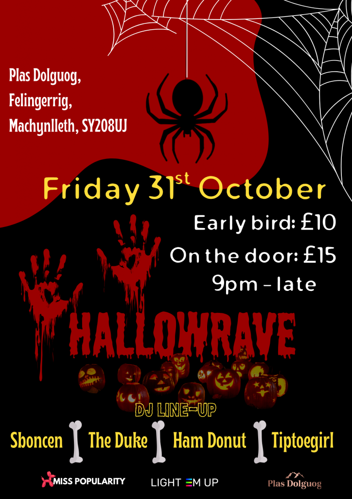 This Halloween, the house comes alive. Step into HALLOWRAVE, Plas Dolguog’s adult-only Halloween party – a night of thumping beats, eerie lights, and hauntingly good vibes in one of Mid Wales’ most atmospheric settings.